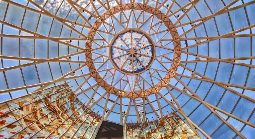 - Im Victory Hall ruht ein gläsernes Kuppeldesign, das an den Reichstag und die Beflaggung durch sowjetische Soldaten erinnert. Innen weht die weiß-rötlich-weiße Flagge, die Belarus symbolisiert, während im Glas eine Storch-Silhouette – nationales Symbol – integriert ist.